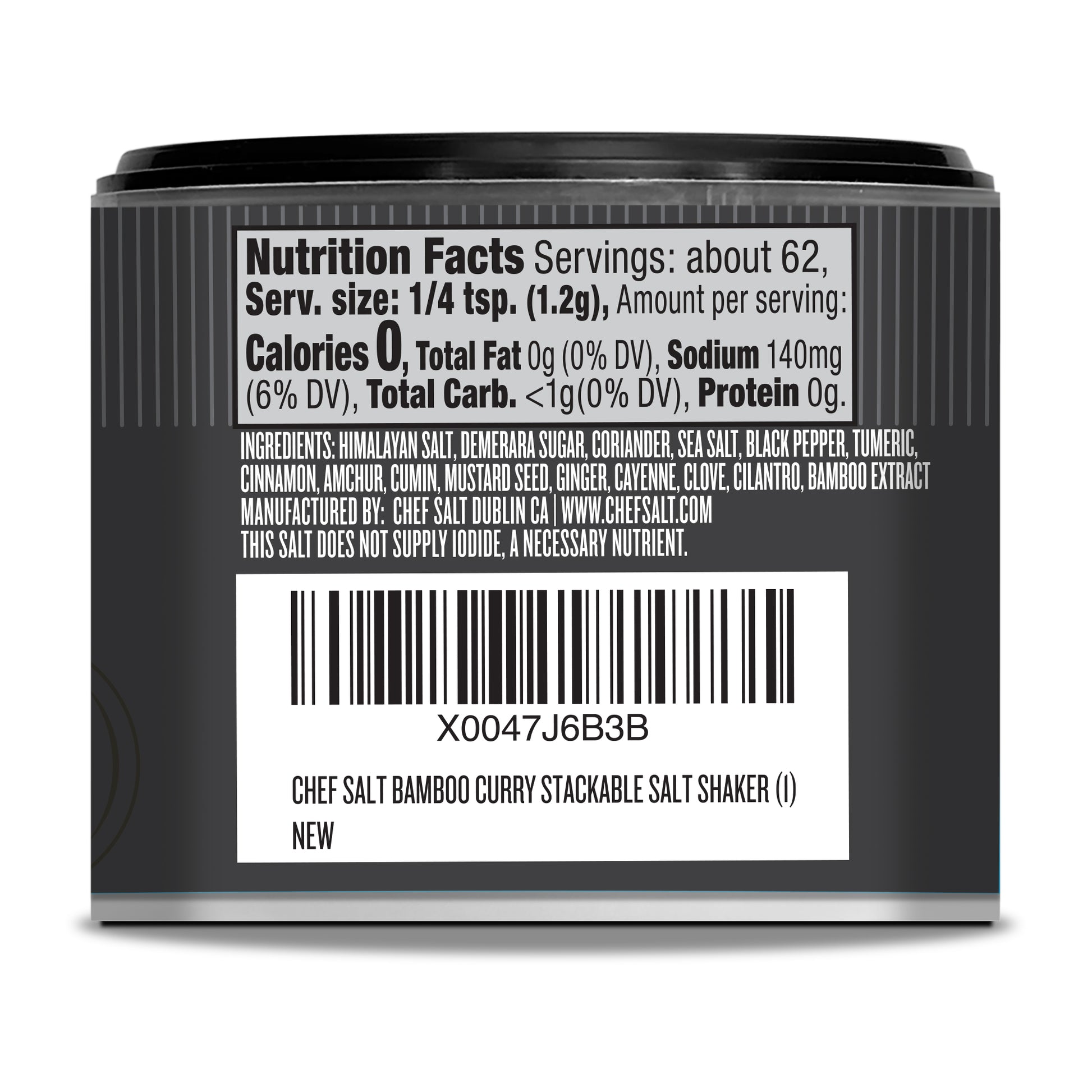 Ingredients: Himalayan salt, demerara sugar, coriander, sea salt, black pepper, turmeric, cinnamon, amchur, cumin, mustard seed, ginger, cayenne, clove, cilantro, bamboo extract. Net weight 2.5oz